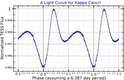 Kappa Cancri, Latinized from κ Cancri, is a blue-white hued binary star system in the zodiac constellation of Cancer. It is faintly visible to the naked eye with an apparent visual magnitude of +5.23.[3] The magnitude difference between the two stars is about 2.6.[10] Based upon an annual parallax shift of 5.3209 mas as seen from the Earth,[2] the system is located roughly 610 light-years from the Sun.