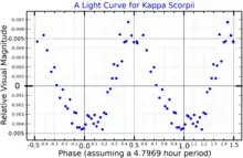 The primary component of the pair, κ Sco A, is a variable star of Beta Cephei type. It is undergoing radial pulsations with a dominant frequency of 4.99922 cycles per day, or 4.8 hours per cycle. There are overlapping secondary pulsation frequencies of about 4.85 and 5.69 cycles per day.[11] This star has about 17 times the mass of the Sun and is nearly 7 times the Sun's radius.[7] The effective temperature of the outer envelope is 23,400 K,[7] giving it a blue-white hue. It is rotating rapidly, with an estimated period of only 1.9 days and an axis of rotation that is inclined by about 40° to the line of sight from the Earth.[7]