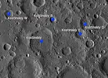 By convention these features are identified on lunar maps by placing the letter on the side of the crater midpoint that is closest to Kostinskiy.