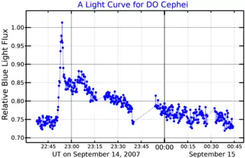 The larger, primary star is designated component A, while the secondary, smaller star is labeled component B. Component A has about 27% of the Sun's mass and 35% of the Sun's radius. Component B has about 18% of the Sun's mass and 24% of the Sun's radius.[5][6] Component B is a flare star and has been given the variable star designation "DO Cephei".[10] It is an irregular flare that typically doubles in brightness and then returns to normal over an 8-minute period.