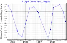 LL Pegasi is obscured at visual wavelengths, but is strongly variable in brightness at infrared wavelengths.[8] It is classified as a Mira variable and has a period of about 696 days.[9]
