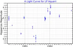 LP Aquarii is a pulsating variable star in the constellation of Aquarius that varies between magnitudes 6.30 and 6.64.[3] The position of the star near the ecliptic means it is subject to lunar occultations.[11]