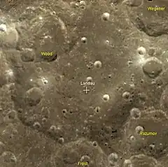 Landau is a large lunar impact crater that is located in the northern hemisphere on the far side of the Moon. It was named after physicist Lev Landau. The crater Wegener is attached to the northeastern rim. Attached to the southeastern rim is Frost.