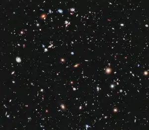 In astronomy, a deep field is an image of a portion of the sky taken with a very long exposure time, in order to detect and study faint objects. The depth of the field refers to the apparent magnitude or the flux of the faintest objects that can be detected in the image.[2] Deep field observations usually cover a small angular area on the sky, because of the large amounts of telescope time required to reach faint flux limits. Deep fields are used primarily to study galaxy evolution and the cosmic evolution of active galactic nuclei, and to detect faint objects at high redshift. Numerous ground-based and space-based observatories have taken deep-field observations at wavelengths spanning radio to X-rays.