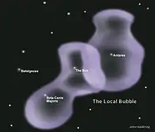 ![]() Artist's conception of the Local Bubble (containing the Sun and Beta Canis Majoris) and the Loop I Bubble (containing Antares) |