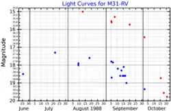 ![]() Light curves for M31-RV, adapted from Boschi and Munari (2004).[1] The red dots show the red band magnitude, and the blue dots show the blue band magnitude. | |