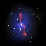 MS 0735.6+7421 is a galaxy cluster located in the constellation Camelopardalis, approximately 2.6 billion light-years away. It is notable as the location of one of the largest central galactic black holes in the known universe, which has also apparently produced one of the most powerful active galactic nucleus eruptions discovered.[2]