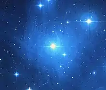 Maia is surrounded by the Maia Nebula (also known as NGC 1432), a reflection nebula that is one of the brightest patches of nebulosity within the Pleiades star cluster.[25] It is the only member of the New General Catalogue discovered photographically.[26]