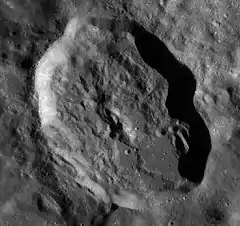 Mariotte is an elongated crater that is located on the far side of the Moon, named after the physicist Edme Mariotte.[1] This formation is located about one crater diameter to the southwest of the smaller Das. This crater is longer to the southeast by about an extra 5 km, giving this feature an egg-shaped outline. The outer rim is sharp-edged and little eroded. The interior floor is uneven, particularly toward the southeastern end. To the southeast of Mariotte is the large crater Chebyshev.