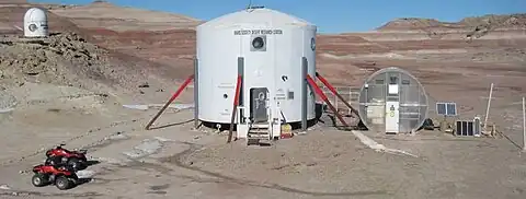 A Mars analog habitat is one of several historical, existing or proposed research stations designed to simulate the physical and psychological environment of a Martian exploration mission. These habitats are used to study the equipment and techniques that will be used to analyze the surface of Mars during a future crewed mission, and the simulated isolation of the volunteer inhabitants allows scientists to study the medical and psychosocial effects of long-term space missions. They are often constructed in support of extensive Mars analogs (see List of Mars analogs). However, sometimes existing natural places are also valued as Mars analogs. Crewed Mars habitats are featured in most human Mars missions; an alternative may be terraforming or telepresence.
