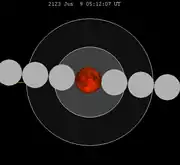 ![]() The greatest eclipse of the series will occur on 2123 Jun 9, lasting 106 minutes.[2] |