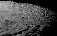 However, the current favoured hypothesis is that they formed via extensional processes at the tops of diapirs, or upwellings of warm ice from within Miranda itself.[25][30][31][32] The coronae are surrounded by rings of concentric faults with a similar low-crater count, suggesting they played a role in their formation.[29] If the coronae formed through downwelling from a catastrophic disruption, then the concentric faults would present as compressed. If they formed through upwelling, such as by diapirism, then they would be extensional tilt blocks, and present extensional features, as current evidence suggests they do.[31] The concentric rings would have formed as ice moved away from the heat source.[33] The diapirs may have changed the density distribution within Miranda, which could have caused Miranda to reorient itself,[34] similar to a process believed to have occurred at Saturn's geologically active moon Enceladus. Evidence suggests the reorientation would have been as extreme as 60 degrees from the sub-Uranian point.[33] The positions of all the coronae require a tidal heating pattern consistent with Miranda being solid, and lacking an internal liquid ocean.[33] It is believed through computer modelling that Miranda may have an additional corona on the unimaged hemisphere.[35]