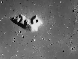 The selenographic coordinates of this feature are 27.8° N, 25.5° W, and it has a maximum diameter at the base of 25 km. The mountain base has a shape roughly like an arrow head, with the point oriented toward the west-northwest. The peak has a height of 1.5 km above the surface.