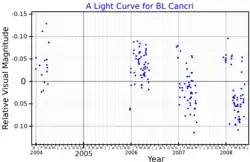 Mu1 Cancri, Latinised from μ1 Cancri, is a variable star in the zodiac constellation of Cancer. The name Mu1 comes from the Bayer naming system: the "1" in the name is because (from Earth) it appears to be close to 10 Cancri, or Mu2 Cancri. It is also known by the variable star designation BL Cancri. The star is dimly visible to the naked eye with an apparent visual magnitude that ranges from 5.87 down to 6.07.[4] Parallax measurements put it about 630 light-years (192 parsecs) from the Sun.[10] At that distance, the visual magnitude is diminished by an extinction factor of 0.28.[11] The position of the star near the ecliptic means it is subject to lunar occultations.[12]