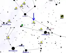 NGC 1746 is an asterism in the constellation Taurus that was described in 1863 by Heinrich Louis d'Arrest and as a result was recorded in the New General Catalogue (NGC). Previously, the object was classified as an open cluster; however, it was shown through more recent observations that it is a random formation of stars in Earth's sky, an asterism. NGC 1746 has an apparent magnitude of 6.1 and an apparent size of about 40'.