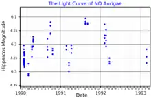 NO Aurigae is listed in the General Catalogue of Variable Stars as a slow irregular variable, indicating that no regularity could be found in the brightness variations. Other studies have suggested possible periods of 102.1, 173, and 226 days, and would classify it as a semiregular variable star.[10] The maximum visual magnitude range is 6.05–6.50.[10]