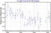 NS Puppis is a naked eye star, given the h1 and the Bright Star Catalogue number 3225. It was considered to be a stable star[8][9] until 1966.[10] It was given the variable star designation NS Puppis in 1975.[11]