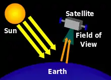 Nadir also refers to the downward-facing viewing geometry of an orbiting satellite,[1] such as is employed during remote sensing of the atmosphere, as well as when an astronaut faces the Earth while performing a spacewalk. A nadir image is a satellite image or aerial photo of the Earth taken vertically. A satellite ground track represents its orbit projected to nadir on to Earth's surface.
