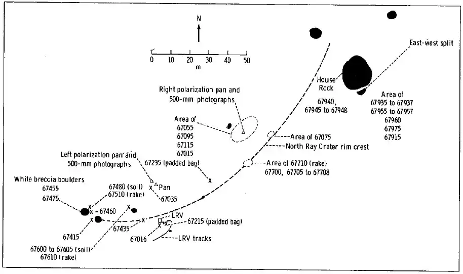 The Apollo 16 Lunar Module (LM) Orion landed between North Ray and South Ray craters on April 21, 1972. The astronauts John Young and Charles Duke explored the area between the craters over the course of three EVAs using a Lunar Roving Vehicle, or rover. They visited North Ray on EVA 3, at station 11, about 4.4 km north of the landing site. On the way, they drove along the rim of the similar sized but older crater Palmetto, which is approximately 3 km south of North Ray.