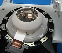 Each focusing optic has its own focal plane module, consisting of a solid state cadmium zinc telluride (CdZnTe) pixel detector[20] surrounded by a cesium iodide (CsI) anti-coincidence shield. One detector unit — or focal plane — comprises four (two-by-two) detectors, manufactured by eV Products. Each detector is a rectangular crystal of dimension 20 × 20 mm (0.79 × 0.79 in) and thickness ~2 mm (0.079 in) that have been gridded into 32 × 32 × 0.6 mm (1.260 × 1.260 × 0.024 in) pixels (each pixel subtending 12.3 arcseconds) and provides a total of 12 arcminutes field of view (FoV) for each focal plane module.