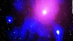 ![]() Combined XMM-Newton and GMRT image of the Ophiuchus Cluster, with NeVe 1 being the bright, purple spot. The blue cloud on its lower left is the remnant of the eruption. | |