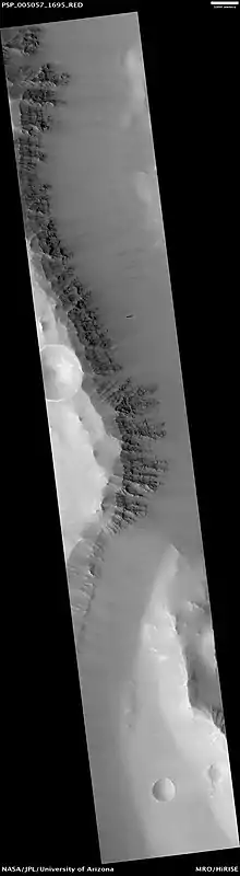Oudemans' layers are from as deep or deeper than those exposed in Valles Marineris. A comparison of the layers in Valles Marineris and in the Oudemans central uplift may prove that they are similar rock types that share the same origin. Three other craters in the area, Martin (21.2°S, 290.7°E), Mazamba (27.3°S, 290.2°E) and a yet unnamed crater (28.4°S, 305°E) also possess finely layered materials in their central uplift features. The preservation of the layering and geographical occurrence of these four craters suggests that they could be ash layers deposited from numerous episodes from the Tharsis volcanoes. Voluminous volcanic episodes could have produced large volumes of layered rock that could have been rapidly buried and protected from cratering.[3] The great detail available with HiRISE shows the layers to be both numerous and varied. Some layers are far harder than others because they form steep sides. Other layers form slopes. This same arrangement is common on the Earth. Steep slopes and slopes are easily observed in the walls of the Grand Canyon; slopes often occur when shale erodes into clay. If clay exists in some layers, then they were probably formed when water was present. Clay requires water to form. So the slopes may show periods of time when water covered the area. Perhaps life was abundant then. Click on the image below of the wall of Oudemans crater for a good view of these layers.