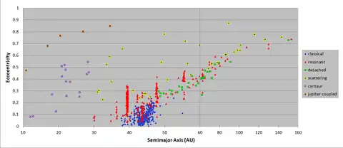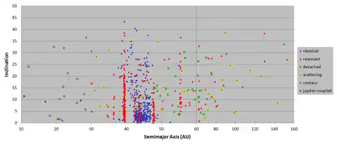 OSSOS has detected 838 objects, bring the total objects detected by well characterized surveys to more than 1100.[6][7] Among these objects are a possible dwarf planet in a 9:2 resonance with Neptune,[8] and two objects in a 9:1 resonance with Neptune.[9] Other resonant objects have been detected and their populations estimated.[10] A previously identified 'kernel' in the cold classical Kuiper belt has been confirmed and other cold classical objects beyond the 2:1 resonance with Neptune have been identified.[4] OSSOS detected 3 potential members of the Haumea family, but none of these were faint, indicating that the family has a shallow size distribution.[11] Analysis of the size distribution of the scattering population revealed a break in its slope.[3][12] The inclination distribution of these scattering objects had more with inclinations greater than 45 degrees than predicted using simulations that included only the known planets and the influence of the galaxy, but also fewer with inclinations between 15 and 30 degrees than predicted when Planet Nine was added to the simulations.[13] Extreme trans-Neptunian objects (eTNOs) have been found including one with a semi-major axis of 730 AU, 2013 SY99,[14] and seven other objects with semi-major axes greater than 150 AU and perihelia greater than 30 AU. After accounting for OSSOS's known biases the orbital elements of these objects are consist with a uniformly distributed population.[15] Four scattered disk objects with high perihelia have been detected with semi-major axes smaller than nearby resonances, consistent with their escape during a slow grainy migration of Neptune.[16] Closer to the Sun, 20 centaurs were found, none of which were active.[17] The number of centaurs detected and their inclinantion distribution were consistent with a model of the early Solar System that included a slow, long range migration of Neptune.[18] 65 of the smaller objects discovered by OSSOS were later observed using the Subaru telescope to determine the variability of their brightness.[19]