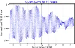PT Puppis (PT Pup) is a star in the constellation Puppis. Anamarija Stankov confirmed this star as a Beta Cephei variable.[4] Analysis of its spectrum and allowing for extinction gives a mass 7.94 times that of the Sun, a surface temperature of 19,400 K and luminosity of 6405 Suns.[3]