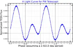 PW Tel was first noticed to vary in brightness in observations taken in 1978 by Pierre Renson.[20] The star was confirmed to be variable and was given the variable star designation PW Telescopii in 1981. Further observations by Jean Manfroid in 1985 improved earlier data, including the star's period.[21] PW Tel is an α2 CVn variable[6] that has an amplitude of 0.011 magnitudes within the visual passband and a period of 2.92 days.[22]