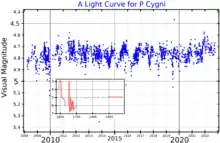 A visual band light curve for P Cygni. The main plot is from AAVSO data.[16] The inset plot, adapted from de Groot (1988),[17] shows the variability for the first 400 years after the star's discovery.