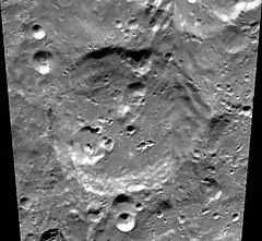 This is a moderately worn crater formation with features that have become rounded and less well defined due to impact erosion. There are only a few small craterlets along parts of the rim and inner wall. Some faded terrace structures appear along parts of the inner wall to the east and south. Within the interior are small craters in the southwest and northeast sections of the floor. Near the midpoint is a worn central peak.