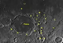 By convention these features are identified on lunar maps by placing the letter on the side of the crater midpoint that is closest to Pitatus.
