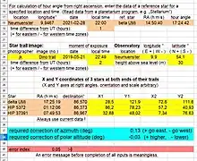 Polar Alignment with Excel[5][6] is a method for polar alignment of equatorial mountings for astronomical telescopes, using a digital camera and a computer.