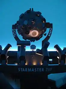 The planetarium uses a Starmaster projector, manufactured by Carl Zeiss AG, which was installed in 2006 to replace the original Universarium III purchased in 1952. 44 additional projectors are also used.[3] The projection dome has a capacity of 300 people, with a circular arrangement of reclining seats and projection at the top of the dome.[1] The dome spans 18 metres (59 ft),[2][7] and is on one floor[4] with a mezzanine.[3] The metal and concrete half-dome is surrounded by a yellow disk, and the interior is made of wood.[5]