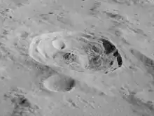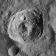 Römer is a lunar impact crater that is located to the north of the Sinus Amoris in the northeast section of the Moon. It was named after Danish astronomer Ole Rømer.[1] It lies in the southwestern part of the mountainous region named the Montes Taurus. It was unofficially named as Atatürk by astronomer Hugh Percy Wilkins in his lunar map, possibly due to the fact that the Montes Taurus (or Toros Dağları in Turkish) are located in Turkey. To the west-northwest is the crater-bay Le Monnier, on the eastern edge of Mare Serenitatis.