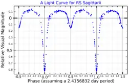 RS Sagittarii is an eclipsing binary star system in the southern constellation of Sagittarius, abbreviated RS Sgr. It is a double-lined spectroscopic binary with an orbital period of 2.416 days,[8] indicating that the components are too close to each other to be individually resolved. The system has a combined apparent visual magnitude of 6.01, which is bright enough to be faintly visible to the naked eye. During the primary eclipse the brightness drops to magnitude 6.97, while the secondary eclipse is of magnitude 6.28.[3] The distance to this system is approximately 1,420 light years based on parallax measurements.[2]