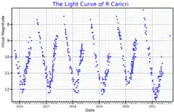 R Cancri is a Mira variable in the constellation Cancer. Located approximately 250 parsecs (830 ly) distant, it varies between magnitudes 6.07 and 12.3 over a period of approximately 357 days.[3]