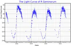 R Geminorum pulsates with an average period of 369.9 days, varying by up to eight magnitudes at visual wavelengths.[3] When at maximum light its apparent visual magnitude is usually between 6 and 7, while at minimum light it is typically near magnitude 14.[7]
