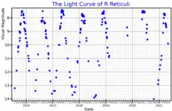 R Reticuli, also listed under the duplicate variable star designation S Reticuli,[4] is a Mira variable star in the southern constellation Reticulum. It is an aging red giant star on the asymptotic giant branch[5] with a stellar classification that varies between M4e to M7.5e,[6] being hottest near maximum visual magnitude.[10] The brightness of the star varies between apparent visual magnitudes 6.35 and 14.2[4] with an average period of 281.08±0.58 d.[11] The mean maximum magnitude is 7.57 and the mean minimum magnitude 13.80.[11]