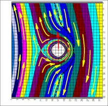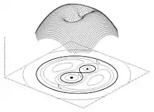 Close to each star, surfaces of equal gravitational potential are approximately spherical and concentric with the nearer star. Far from the stellar system, the equipotentials are approximately ellipsoidal and elongated parallel to the axis joining the stellar centers. A critical equipotential intersects itself at the L1 Lagrangian point of the system, forming a two-lobed figure-of-eight with one of the two stars at the center of each lobe. This critical equipotential defines the Roche lobes.[2]