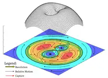 In the gravity potential graphics, L1, L2, L3, L4, L5 are in synchronous rotation with the system. Regions of red, orange, yellow, green, light blue and blue are potential arrays from high to low. Red arrows are rotation of the system and black arrows are relative motions of the debris.