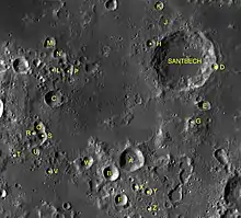 By convention these features are identified on lunar maps by placing the letter on the side of the crater midpoint that is closest to Santbech.[3]