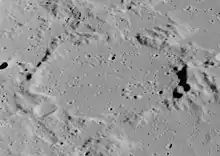Saunder is a lunar impact crater located in the central highland region of the Moon, to the east-northeast of the walled plain Hipparchus. Its diameter is 44 km. It was named after British mathematician Samuel Arthur Saunder.[1] The outer wall is irregular and broken in several locations, forming the overall shape of a pentagon. The interior of Saunder has been flooded with lava, forming a level surface just below the rim. The floor lacks a central peak, but there are low rises in the southeast quadrant and a tiny craterlet towards the north rim.