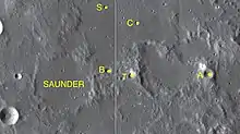 By convention these features are identified on lunar maps by placing the letter on the side of the crater midpoint that is closest to Saunder.