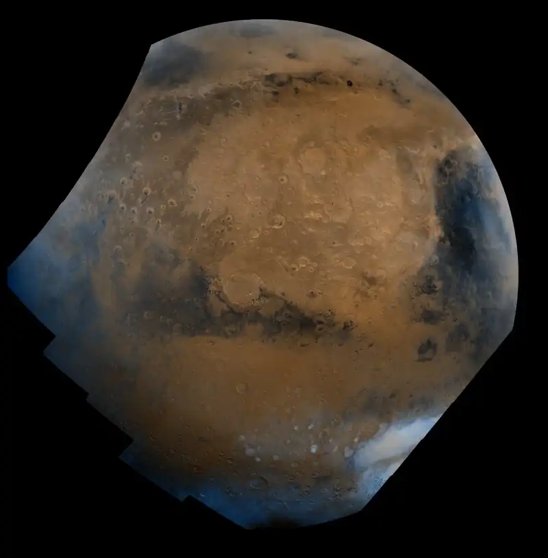 A crater within Schiaparelli shows many layers that may have formed by the wind, volcanoes, or deposition under water.