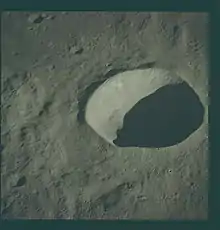 Schmidt is a small lunar impact crater that is located near the southwest edge of Mare Tranquillitatis, to the southwest of the Ritter–Sabine crater pair. It was named after German astronomer Johann Friedrich Julius Schmidt, German optician Bernhard Schmidt and Soviet astronomer Otto Schmidt.[1] This formation is circular and bowl-shaped, with little appearance of wear due to subsequent impacts. The interior has a higher albedo than the surrounding terrain, giving it a light appearance. The exterior consists of hummocky terrain with many boulders, ranging up to 100 m or more in diameter.
