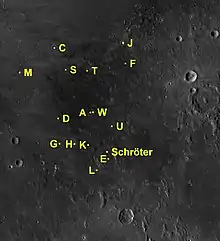 By convention these features are identified on lunar maps by placing the letter on the side of the crater midpoint that is closest to Schröter.