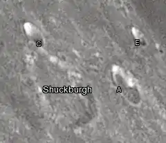By convention these features are identified on lunar maps by placing the letter on the point of the crater rim that is closest to Shuckburgh.