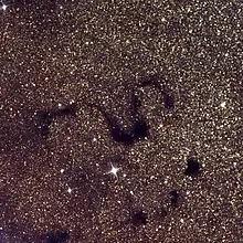 The Snake Nebula (also known as Barnard 72) is a dark nebula in the Ophiuchus constellation. It is a small but readily apparent SP-shaped dust lane that snakes out in front of the Milky Way star clouds from the north-north-west edge of the bowl of the Pipe Nebula. Its thickness runs between 2′ and 3′ and runs around 6′ in the north-west / south-east orientation. A good view in a 4" to 6" telescope requires clear dark skies.