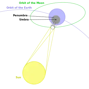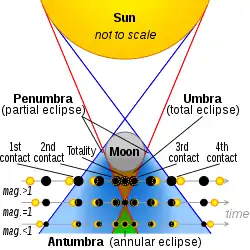 The diagrams to the right show the alignment of the Sun, Moon, and Earth during a solar eclipse. The dark gray region between the Moon and Earth is the umbra, where the Sun is completely obscured by the Moon. The small area where the umbra touches Earth's surface is where a total eclipse can be seen. The larger light gray area is the penumbra, in which a partial eclipse can be seen. An observer in the antumbra, the area of shadow beyond the umbra, will see an annular eclipse.[17]
